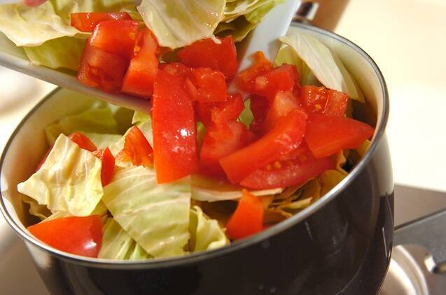 <合わせ調味料>の材料を加え、さらに7~8分煮て、サヤインゲン以外の他の野菜を加えて7~8分煮る。