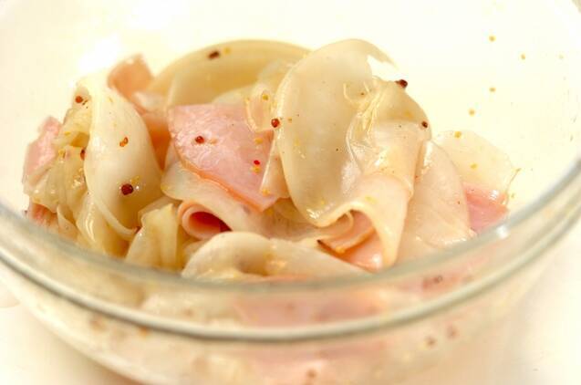 <マリネ液>のボウルにカブとハムを加え、約10分つけておく。貝われ菜を加えて混ぜ合わせ、器に盛る。