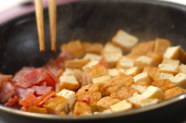 厚揚げは1cm角、ベーコンは幅1cmに切り、一緒にフライパンで焼いて粗熱を取る。ボウルで<和え衣>の材料を混ぜ合わせる。