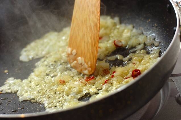 フライパンにオリーブ油、玉ネギ、ニンニク、赤唐辛子を入れ、弱めの中火にかけて炒める。途中で分量外の塩少々を入れ、炒める。