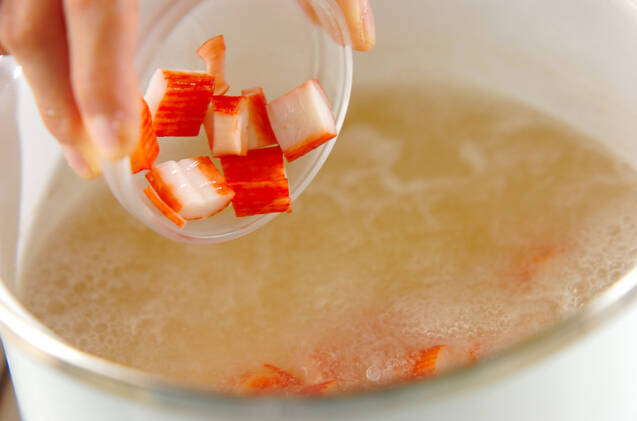 トロミがついてきたらカニ風味カマボコ、<調味料>の材料を加えて火を止める。器に注いで刻みネギを散らし、一味唐辛子を振る。