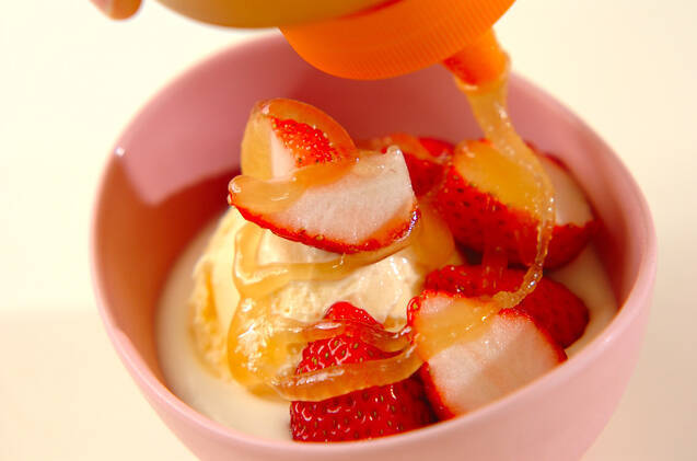 器にバニラアイス、プレーンヨーグルト、イチゴを盛り合わせ、ハチミツをかけてミントの葉を添える。