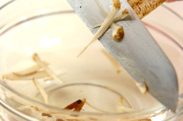 ゴボウはタワシできれいに水洗いし、ささがきにして水に放ち、何回か水を変えてアクを抜く。