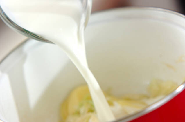 鍋にバターを熱し、白ネギを炒める。しんなりしたら水気をしっかりきったジャガイモを加えて炒め合わせ、<スープ>の材料を加え、煮たつ直前に火を弱め、10~12分煮る。