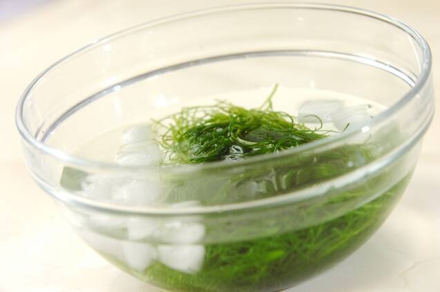 オカヒジキは水でよく洗い、茎がかたければ切り落とす。熱湯で1~2分ゆでて冷水に放ち、水気をよく絞る。