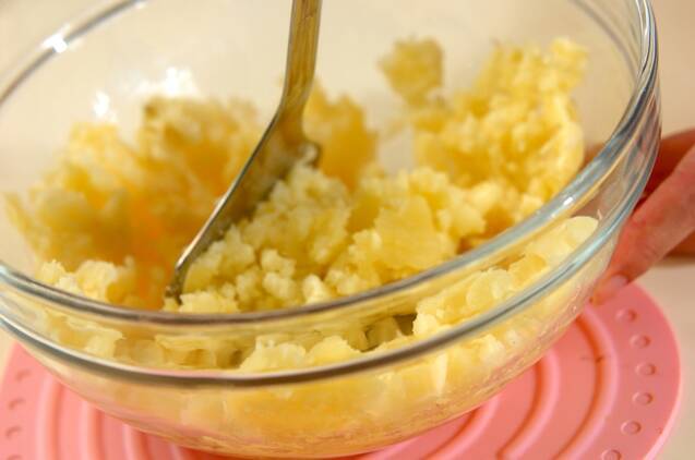 竹串がスッと刺さったら取り出し、熱い間にタオルなどで包みながら皮をむき、マッシャーでつぶす。