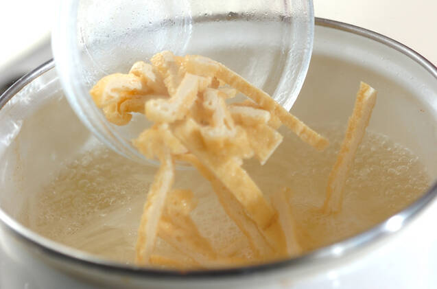 鍋にだし汁を入れて火にかけ、煮たったら大根を入れ、大根が透き通ってきたら油揚げを加える。