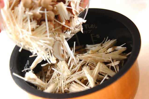 炊飯器に洗ったお米、だし汁、<調味料>を加え、シメジ、エノキ、マイタケ、シイタケ、油揚げ、ショウガを入れて、炊飯器のスイッチを入れる。
