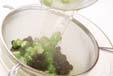 水煮黒豆はザルに上げる。オクラは塩で繊毛をこすり取り水洗いして、1cm幅に切って熱湯に入れ、オクラごと黒豆に掛けて水気を切る。