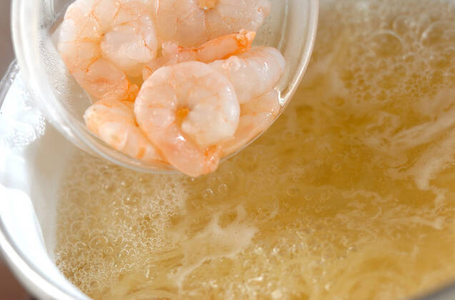 たっぷりの熱湯に分量外の塩を入れてスパゲティーを加え、ゆで上がる30秒前にむきエビも加え、袋の指定時間ゆでて冷水に取る。しっかり冷えたらザルに上げ、しっかり水気をきる。