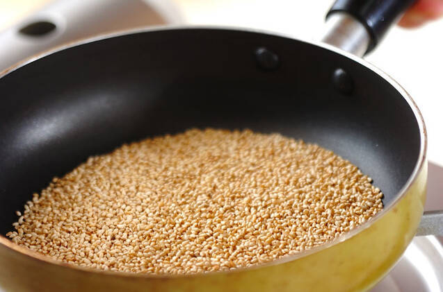 <和え衣>の白ゴマはフライパンで香ばしく炒り、すり鉢で香りよくすって、他の材料と混ぜ合わせる。