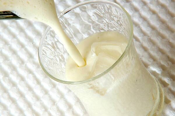 牛乳を加えて更に撹拌し、氷を入れたコップに注ぎ、あればミントの葉を飾る。