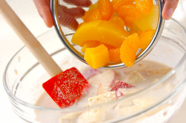 バナナ、リンゴ、缶詰のフルーツを加えて混ぜ合わせる。器に注ぎ分け、ミントの葉を添える。