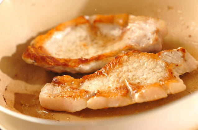 フライパンにオリーブ油を入れて熱し、盛りつけた時表になる面を下にして豚肉を焼く。焼けたら裏返し、焼き色がつくまで焼く。
