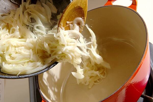 中華鍋またはフライパンにバター20gを中火で熱し、玉ネギを炒め、透き通ってくれば煮込み鍋に入れる。