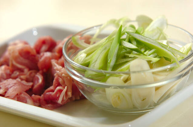鶏もも肉はひとくち大に切り、塩コショウをする。白ネギは斜め薄切りにする。
