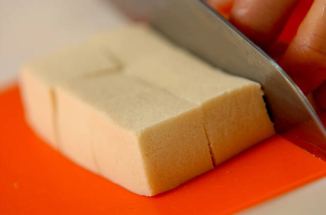 高野豆腐はぬるま湯または水に浸して柔らかくもどし、手ではさんで水気を軽く絞り、食べやすい大きさに切る。