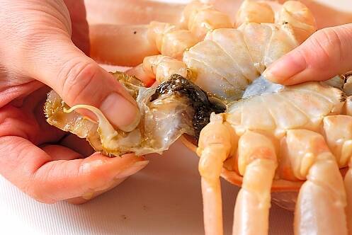 カニ足は足の付け根にある「ガニ」と呼ばれるエラ(灰色のビラビラしたもの)がついている場合は食べられませんので取り除きます。(カニの場合は甲羅をはがし、半分に切る)胴肉と足の間の関節部を切り離し、足は関節ごとに切り離し、関節部分を斜めに切り落とし、太い部分は裏側(内側の白い部分)に切れ目を入れます。胴肉は足の切り口に対して縦になるように、更に半分に切り、開く。