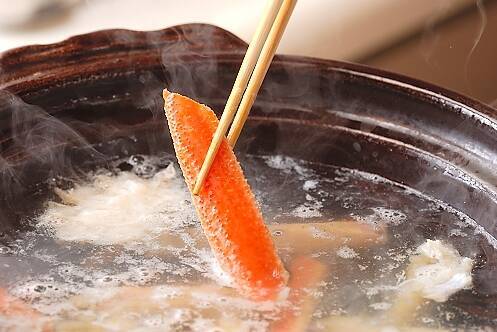 初めにカニを加え、だしが煮立てばカニを引き揚げ<ポン酢>と<薬味>でいただく。