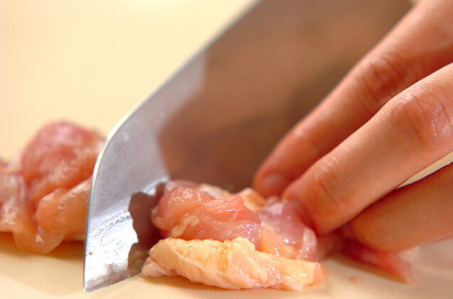 鶏もも肉は身の厚い部分をフォーク等で刺し、食べやすい大きさの削ぎ切りにする。