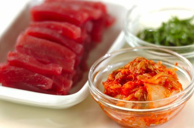 白菜キムチはザク切り、マグロは細切りにする。大葉は軸を切り落として縦半分に切り、さらに横細切りにする。ご飯に作り置き甘酢を混ぜる。