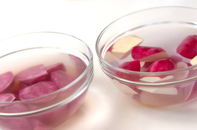 サツマイモは皮ごときれいに水洗いし、ムラサキイモは皮をむき、大きめのひとくち大くらいに切って、それぞれ水に放つ。