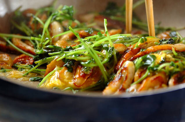 全体にしんなりしたら、<調味料>の材料を加えてからめるように炒め合わせ、溶きほぐした卵を加えて半熟状態になったら、器に盛る。
