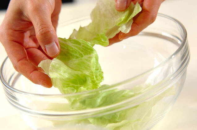 レタスは芯を取って食べやすい大きさにちぎり、水洗いしてザルに上げる。