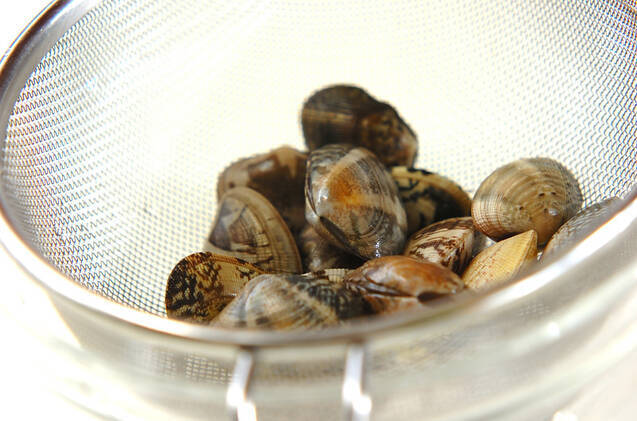 アサリは殻と殻をこすり合わせるように水洗いし、ザルに上げておく。