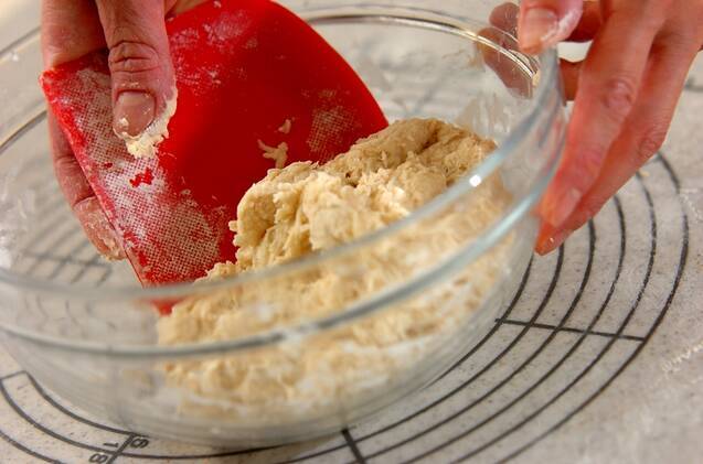 ボウルに強力粉、きび砂糖、塩を入れ、泡立て器で混ぜる。インスタントドライイーストを混ぜ溶かした牛乳を入れてカードでひとまとまりになるまで混ぜる。