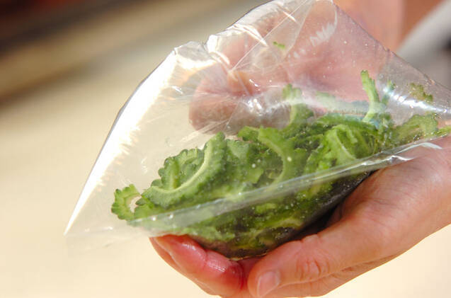 ゴーヤは種を取り、薄い半月切りにして抗菌のビニール袋に入れる。塩を加え、袋に空気を入れて袋の口を持って振り、全体に塩をからめる。袋の空気を抜き、5~6分位置いて水気が出ればサッと水洗いし、しっかり水気を絞る。