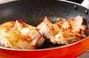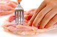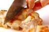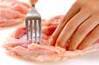 鶏もも肉は身の厚い部分を包丁の先で刺し、半分に切り、味を染みやすくするため、フォークで数カ所刺す。