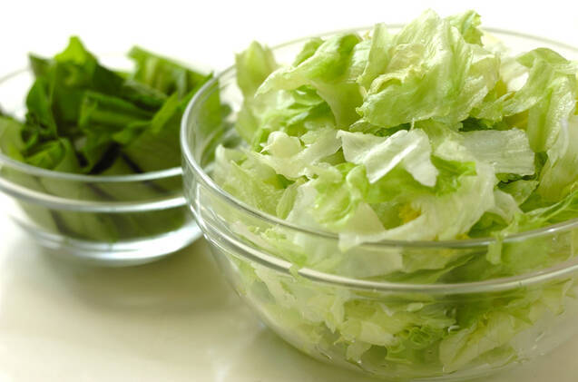 レタスはひとくち大にちぎり、サッと水洗いしてザルに上げる。