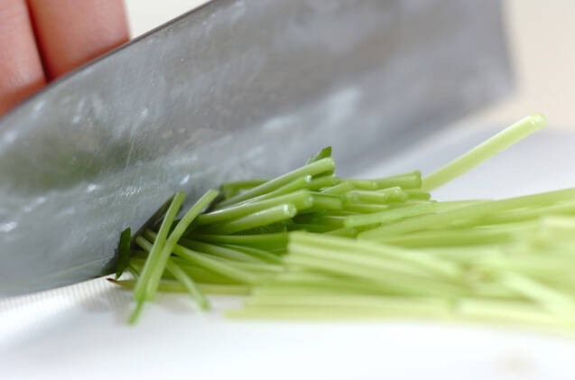ミツバは根元を切り落とし、長さ4cmに切る。