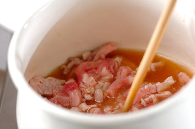 小鍋に<煮汁>の材料を入れて火にかけ、煮たったら豚肉を入れてほぐし、ミツバを加える。