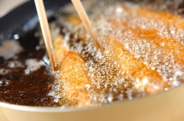 <衣>の合わせた溶き卵、パン粉の順につけ、170℃に熱した揚げ油でキツネ色になるまで揚げ、油をきる。食べやすい大きさに切ってサラダ菜をしいた器に盛り、タルタルソース、プチトマトを添える。