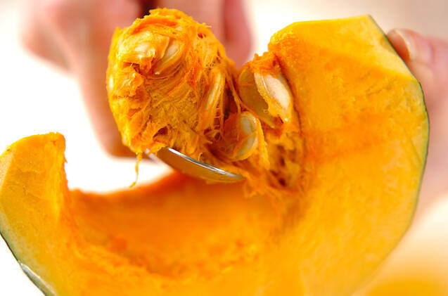 カボチャは種とワタを取り除き、皮を削ぎ落とし、ひとくち大に切る。