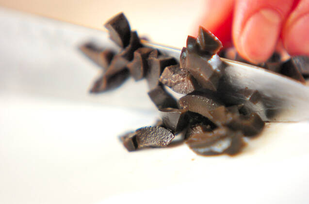 ゆで卵はフォークで粗くつぶし、マヨネーズ、塩、粗びき黒コショウを混ぜ合わせる。ブラックオリーブは粗みじん切りにする。プチトマトはヘタを取り、縦4等分に切る。