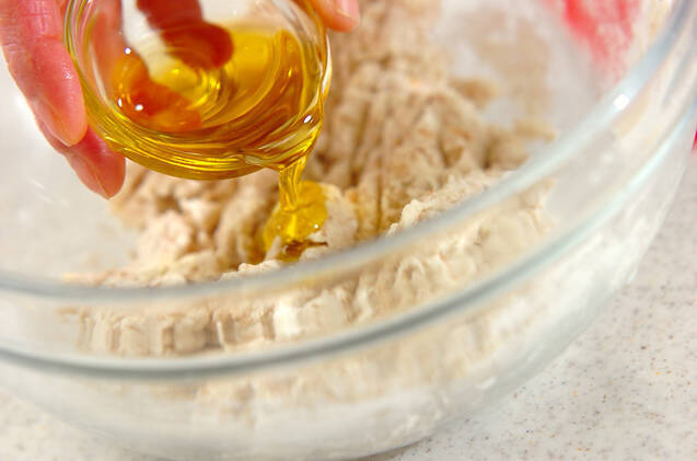 ひとまとまりになったら、オリーブ油を加え、生地を台の上に出してこねる。表面がなめらかになり、膜がしっかりとはったら、温かいところに置き、約2倍に膨らむまで待つ(30~40分)。