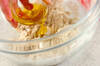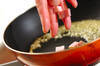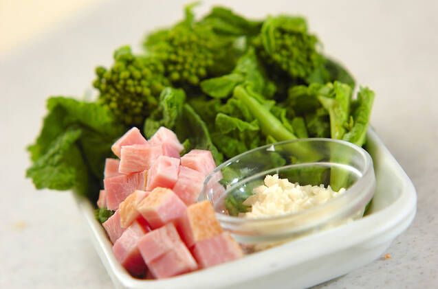 <具材>を作る。菜の花は長さを3等分に切る。ベーコンは5mm角に切る。ニンニクはみじん切りにする。