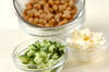 水煮大豆はザルに上げてサッと水洗いし、熱湯をかけて水気をきる。