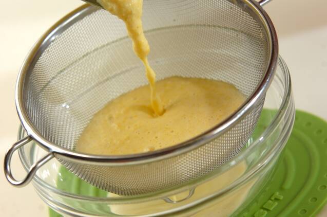 煮たったら火を弱めて3~4分煮、豆乳と共にミキサーに入れてかくはんする。網を通して塩コショウで味を調える。