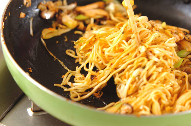 麺全体に炒め色がついてきたら、白ネギ、<合わせ調味料>を加えてからめるように炒め、明太子、ゴマ油少々をまわし掛けてざっくり混ぜて器に盛る。