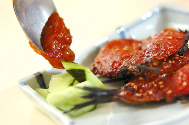 器にアジ、キュウリを盛り、レモン、もろみを添える。