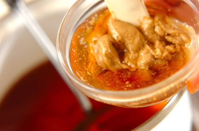 鍋にだし汁とニンジンを入れて強火にかけ、煮たったら弱火にしてみりんとしょうゆを加える。練り白ゴマをだし汁適量で溶き、鍋に戻し入れて火を止める。