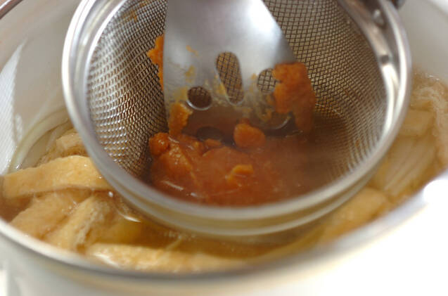 玉ネギが透き通ってきたら油揚げを加え、みそを溶き入れる。豆腐を加え、煮たつ直前に刻みネギを加えてひと混ぜし、器に注ぐ。