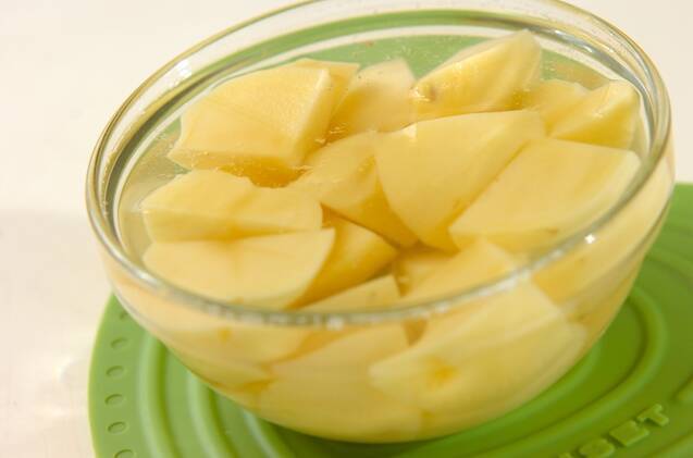 ジャガイモは皮をむき、ひとくち大に切り、水に放つ。