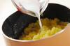 ゆで汁を捨て、鍋を中火にかけて水分を飛ばし、粉ふきいもにし、マッシャーでつぶして、ポテッとする程度に牛乳を加えて混ぜる。