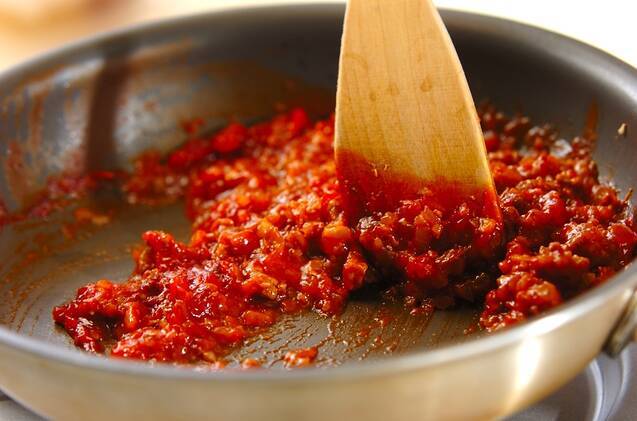 フライパンにサラダ油を熱し、合いびき肉、みじん切りにした玉ネギを炒める。さらにミートソースを加えて半量になるまで煮詰める。