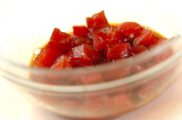 マグロは1cm角に切り、<漬け汁>の材料に10~15分漬け込む。